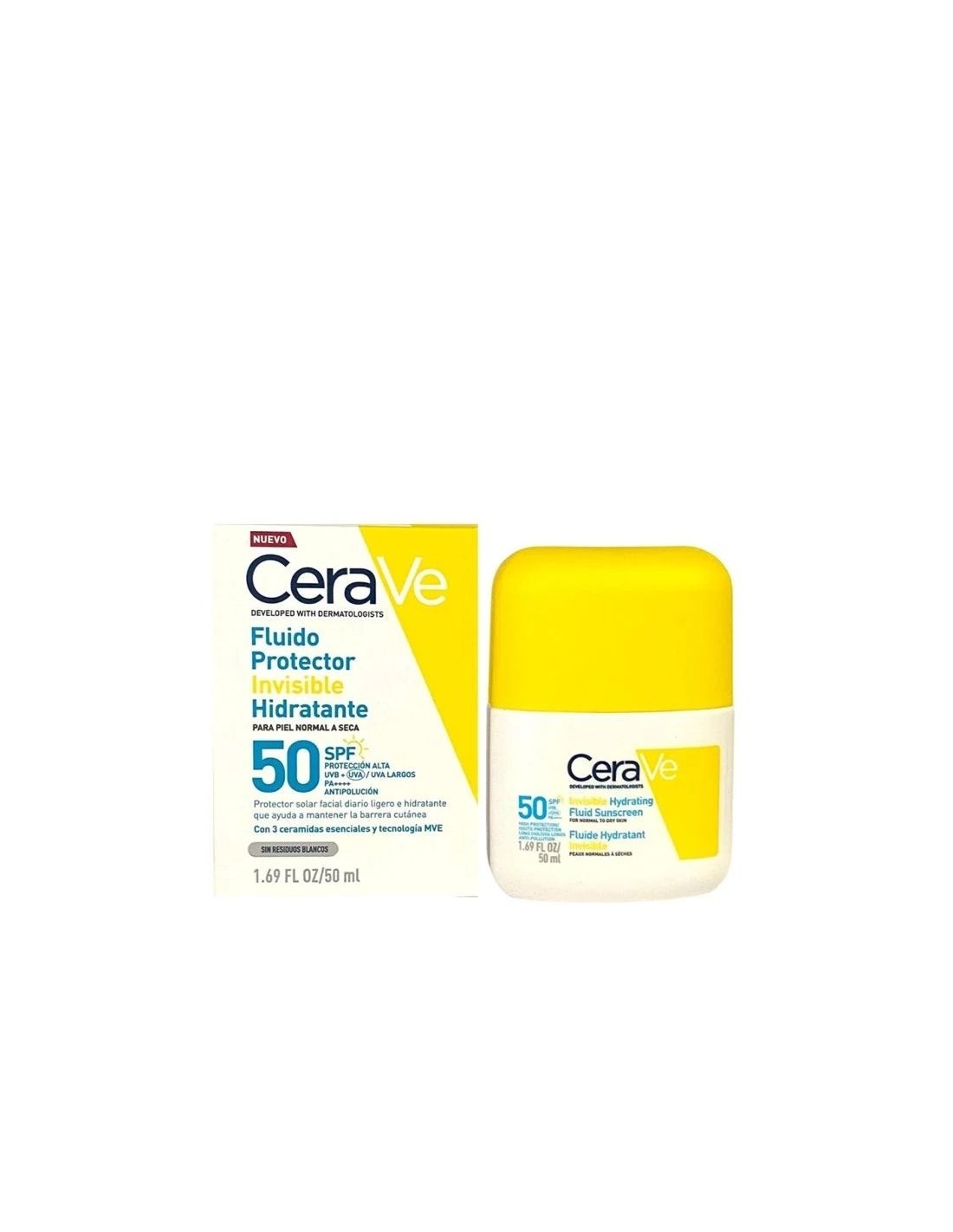 El CeraVe Fluido Protector Invisible Hidratante Spf50 es un protector solar facial de alta protección diseñado para piel normal a seca. Su fórmula avanzada con 3 ceramidas esenciales y tecnología MVE (Emulsión Multivesicular) ayuda a proteger la barrera cutánea mientras proporciona hidratación continua durante todo el día.