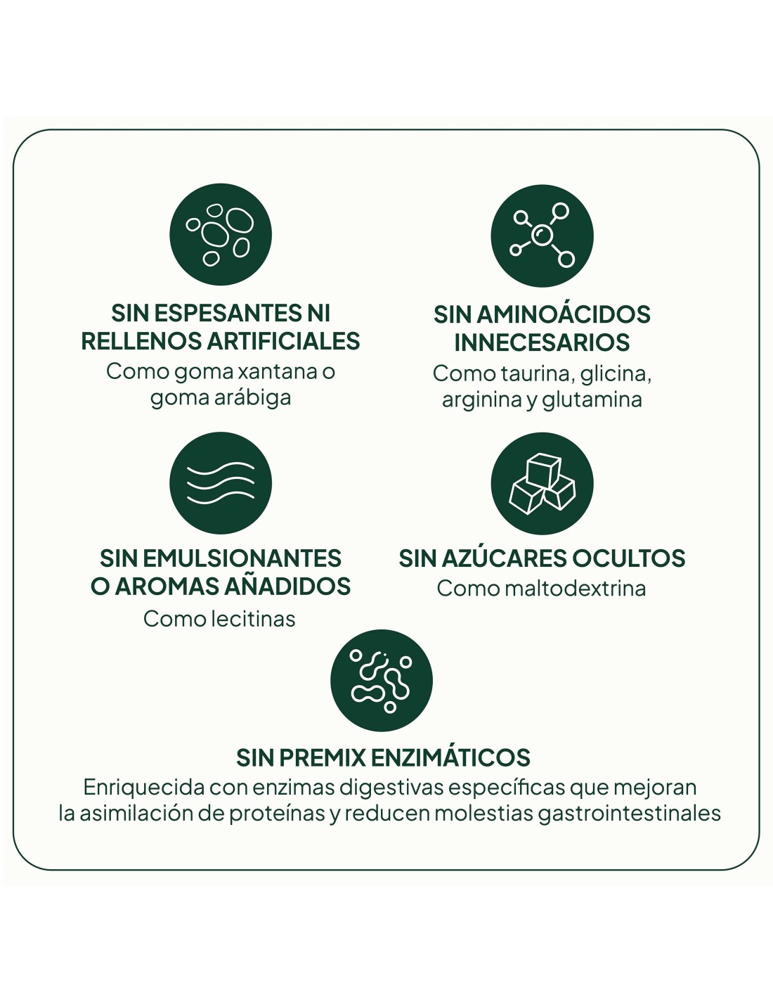 La combinación de proteínas MPI y WPI está enriquecida con enzimas digestivas para mejorar la asimilación de proteínas y reducir molestias gastrointestinales y es una mezcla de alta pureza, sin azúcares ni aminoácidos añadidos y sin maltodextrina, rellenos ni espesantes innecesarios.